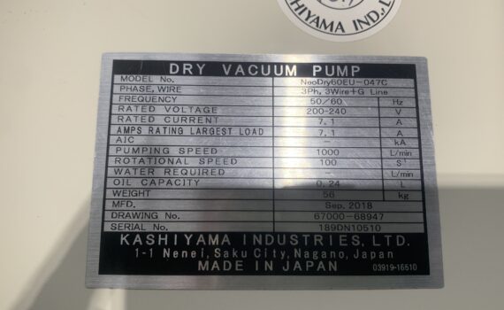 | 仕様(日本語) | 三相、3Wire+G Line 周波数:50Hz / 60Hz 定格電圧:200-240 V 定格電流:7.1 A 最大負荷電流定格:7.1 A 排気速度:1000 L/min 回転速度:100 S⁻¹ オイル容量:0.24 L 重量:56 Kg |